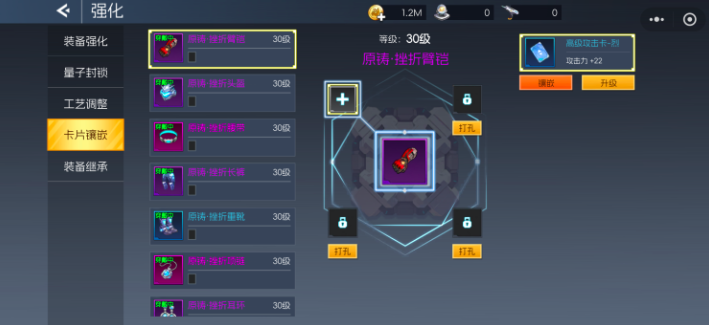 第四部分是卡片镶嵌,也是卡片晶核最常用到的部分,玩家可以在卡槽内镶嵌进不同属性的卡片,不仅可以通过卡片升级来达到更强的效果,而且通过晶核的加持,能够让卡片自身养成数值得到高效突破。(小提示:卡槽数量有限,要想获得更多槽位,需要钻孔机;对于卡槽内已存在卡片时,如果想替换卡片,玩家需要在游戏当中解锁超声取卡器,因此镶嵌卡片要谨慎哦!)