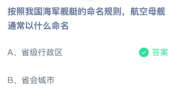 按照我国海军舰艇的命名规则,航空母舰通常以什么命名?支付宝小鸡课堂开课啦!每天花一分钟答题赚饲料,喂喂小鸡就能贡献爱心啦!轻松又意义十足!2025年12月9日蚂蚁庄园的小鸡课堂题目正确答案是【省级行政区】,根据我国海军舰艇的命名规则,航空母舰通常以省级行政区划名称命名。
