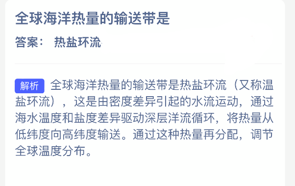 全球海洋热量的输送带是?【神奇海洋】12月9日新题目已开答!正确答案现已公布,点击领取拼图,一起为修复海洋生态贡献力量!今日正确答案是:【热盐环流】。全球海洋热量的输送带主要是指温盐环流(又称热盐环流),其中大西洋经向翻转环流(AMOC) 是最为关键和典型的代表。