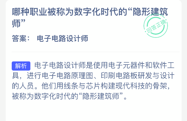 哪种职业被称为数字化时代的“隐形建筑师”?【蚂蚁新村每日一题】2025年12月9日题目已发布!坚持答题,积累木兰币,即可加速小镇建设。答对本题,立即可享“产速+3/时”的加速奖励!今天正确答案是【电子电路设计师】。电子电路设计师被称为数字化时代的“隐形建筑师”.