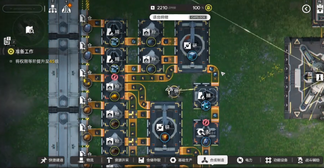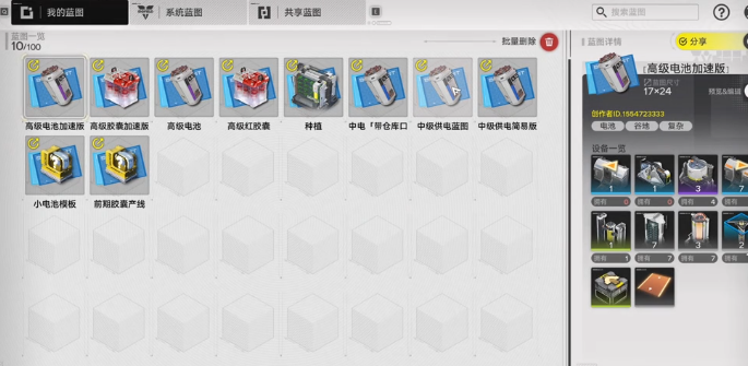 这一条胶囊线还可以灵活的切换,一开始可以用紫晶矿作为原材料,可以造出普通的胶囊。后期如果解锁蓝铁矿,那可以换成蓝铁矿就能产出价值更高的。不需要去额外的搭建新的产线,可以有效节省营地的空间。接着可以看一下电池类的产线,不同等级的电池所对应的就是不一样的供电需求。小电池的生产,就可以用系统自带的蓝图。前期银地没有升级,还没有解锁仓库的去获客。可以通过手动的方法去挑选资源。终极电池,还有三款蓝图可以选择。要是营地空间比较紧张,就可以使用简易版本。