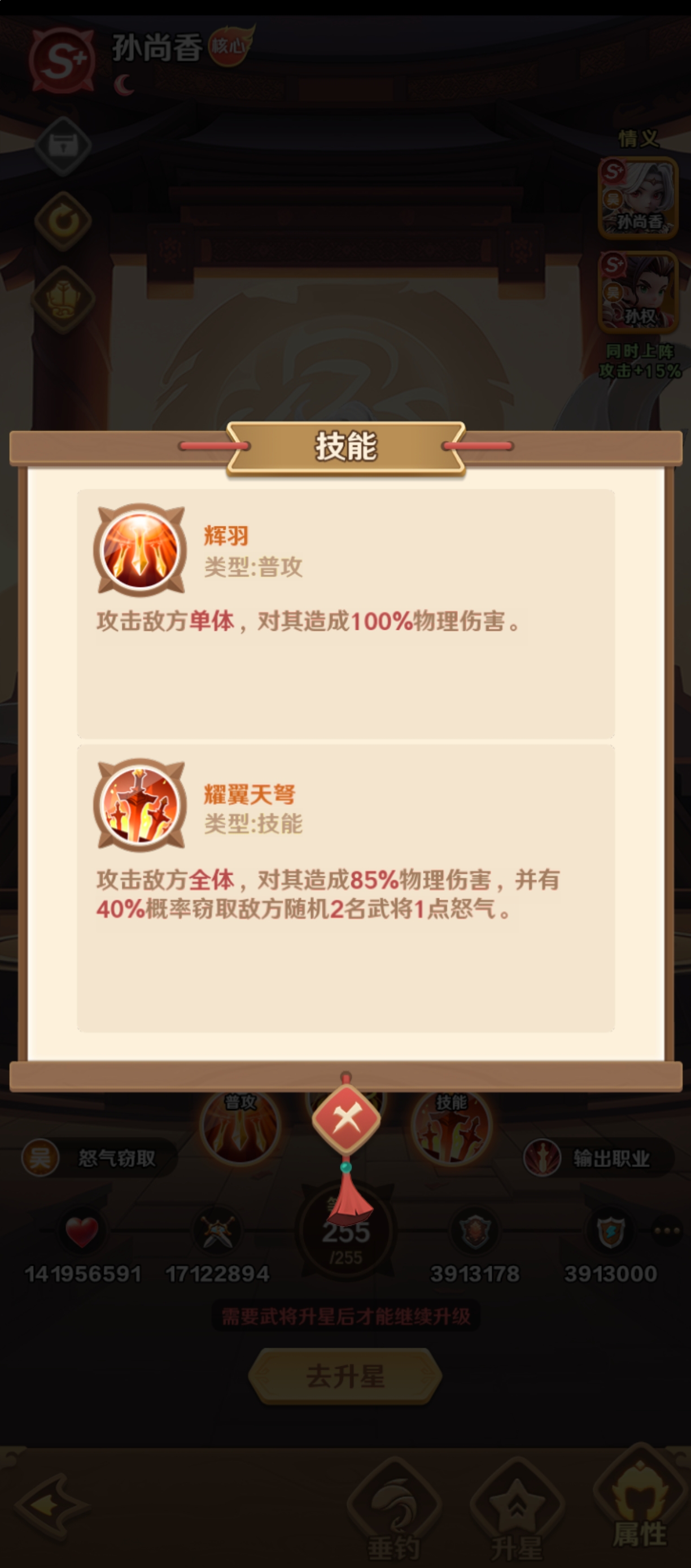 孙尚香作为吴国阵营当中的一员,在战斗的过程当中,能够对敌人单体造成100%的物理伤害,也能够实现高倍率的单体输出,比较适合高威胁的敌人,而他的技能一旦施展之后,可以对敌人全体造成85%的物理伤害。要说他在战斗的过程当中,不仅仅会让整个队伍的输出更加强烈,还能够延缓敌人的技能释放。如果正处于这样的状态,那么自己的队伍优势会更加的明显。