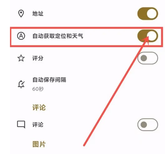 在日记设置页面,开启【自动获取定位和天气】即可。