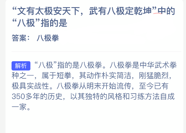 以上就是“文有太极安天下,武有八极定乾坤”中的“八极”指的是?支付宝蚂蚁新村最新答案2025年12月13日,更多精彩内容,请点击关注0405手游网更新!
