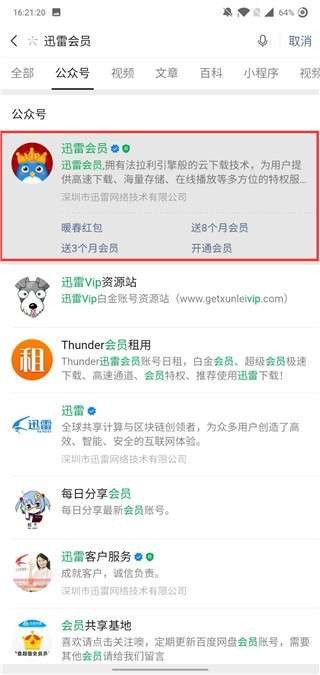 1、最先用手机微信搜索"迅雷会员”,寻找迅雷会员公众号;