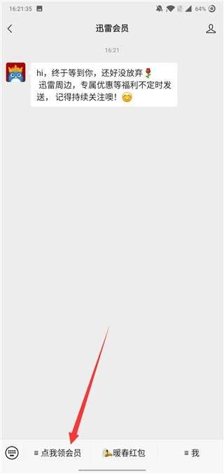 3、关注后,官方会自动发送一个欢迎信息,点击工具栏的"点我领会员",如图:
