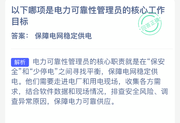 以上就是以下哪项是电力可靠性管理员的核心工作目标?支付宝蚂蚁新村最新答案2025年12月16日,更多精彩内容,请点击关注0405手游网更新!