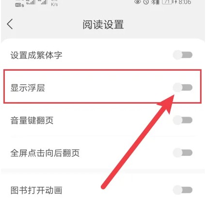 进入阅读设置界面后,开启【显示浮层】即可,如图所示。