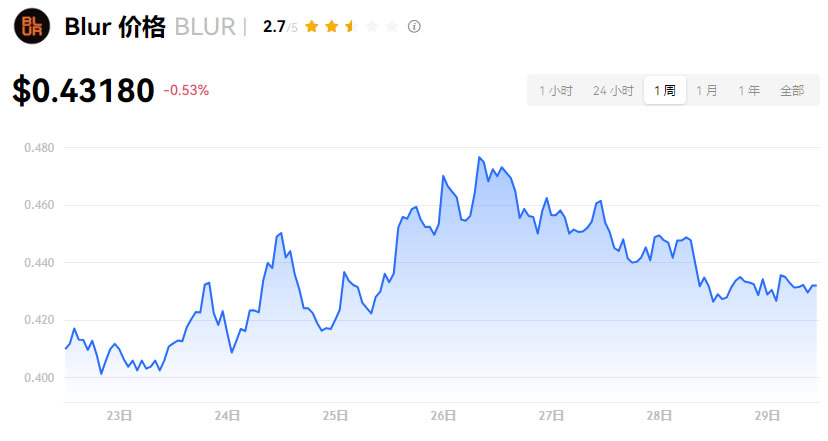 BLUR已在主流交易所上线,用户可通过OKX等平台交易。代币上线初期曾冲高至5.02美元,当前价格稳定在0.4美元区间,日交易量维持在7700万美元以上。