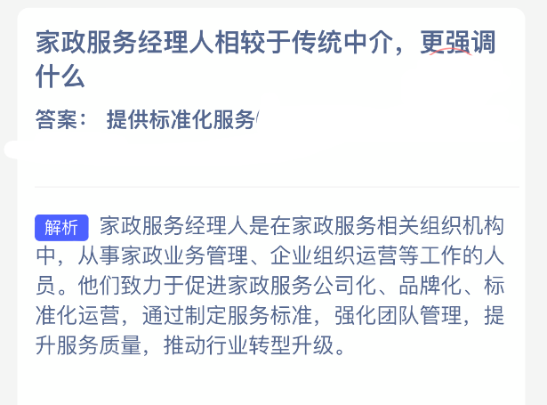 家政服务经理人相较于传统中介,更强调什么?【蚂蚁新村每日一题】2025年12月22日题目已发布!坚持答题,积累木兰币,即可加速小镇建设。答对本题,立即可享“产速+3/时”的加速奖励!今天正确答案是【提供标准化服务】。家政服务经理人相较于传统中介,更强调提供标准化服务。