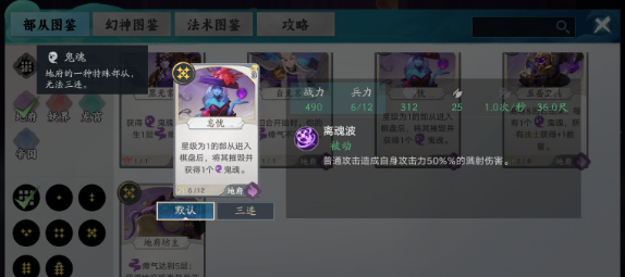 部从就是游戏中的兵种而这个兵种的选择需要根据势力来决定,每个势力拥有独特的技能优势,首先就是幽都,该势力主打后期,依靠鬼魂以及瘴气召唤出强大的兵种进行作战。