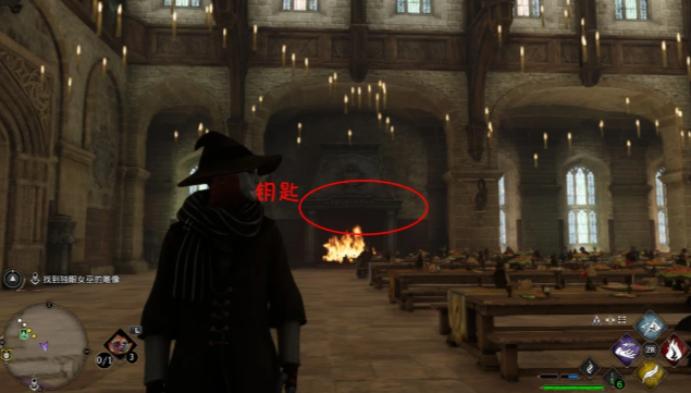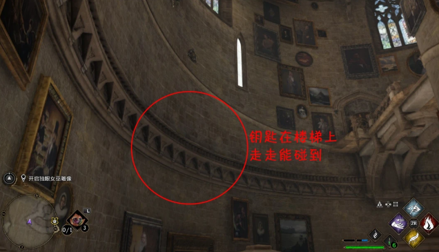 传送至礼堂转身往前推开三道门出去在楼梯上方找到钥匙