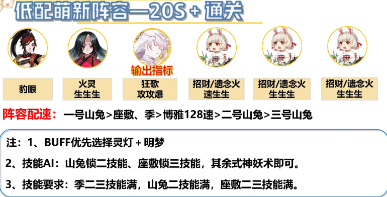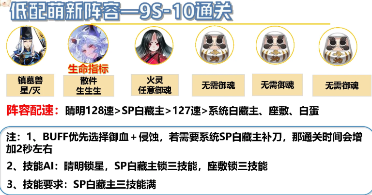 阵容配速:晴明128速>SP白藏主> 127速>系统白藏主、座敷、白蛋
