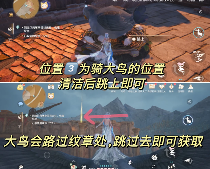 位置3为骑大鸟的位置,清洁后跳上即可,大鸟会路过纹章处,跳过去即可获取