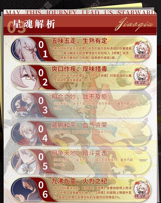 敌方目标被消灭时,其持有的【烬煨】会叠加给场上存活的【烬煨】层数最低的敌人。【烬煨】的层数上限提升至9,每层【烬煨】会使目标的全属性抗性降低3%
