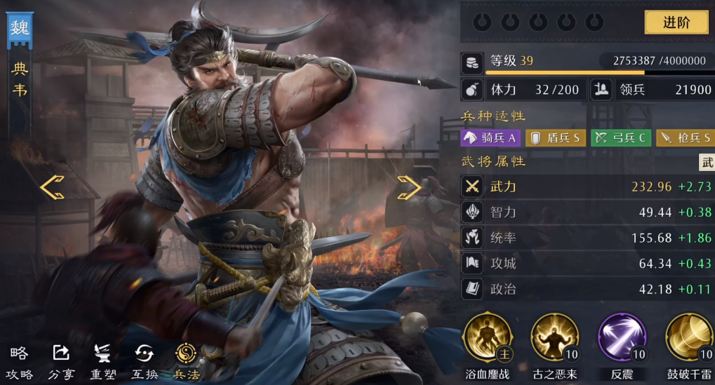 进阶配置可切换为主将曹操体系:其“刮骨疗毒”技能实现自主治疗闭环,降低对专职奶妈的依赖;典韦作为副C兼承伤核心,配合许褚触发反伤协同效果,显著放大反击总伤。该阵容在PVE副本攻坚与野外遭遇战中均表现出色,抗压能力强、容错空间大。若需进一步补强极限输出,董卓可作为高伤补充位加入,确保面对高护甲目标时仍保有稳定破防能力。