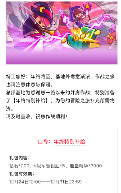 弹壳特攻队总部基地为您送上【年终特别补给】。请使用口令【年终特别补给】兑换,内含钻石200、S级军备钥匙5、能量精华*3000。兑换有效期:12月24日12:00至12月31日23:59。作战辛苦,请及时领取这份冬日暖意。