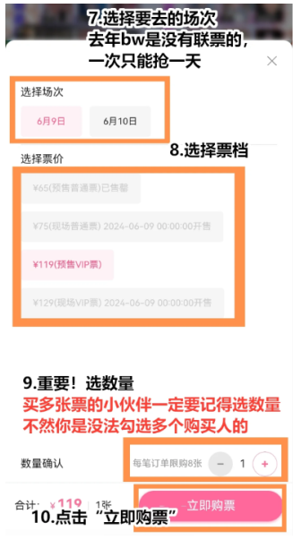 6.选定场次、票种及数量后点击立即购买