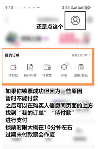 8.若锁票后未及时支付,可在我的订单-待付款中续费(锁票有效期约10分钟)