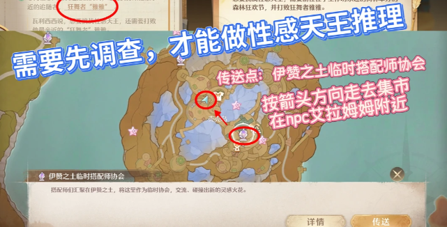如果做不了推理,就要先去调查阅读物,在伊赞之土临时搭配师协会传送点,向上走去集市,在NPC艾拉姆姆附近