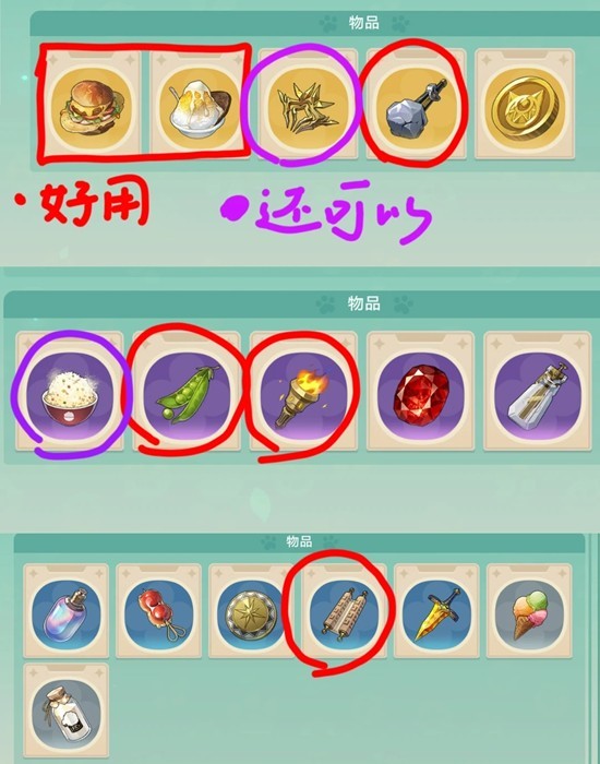 (4)这个阵容会发现都加攻击了,生命力会很低,所以在攻击够了后主要刷火把(阵亡后恢复成5点生命值)、仿制玩具(阵亡后拥有一支30%攻击和30生命的相同奇美拉)、加属性的食物(汉堡、沙冰等等),个人角色在开局的时候如果有市集密卷可以先带上,增加金币,然后后面再换掉。