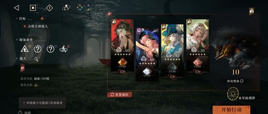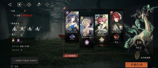 第三关:升阶,配置100助战。背后灵随便带的没用过。第一轮盯着曲娘多用debuff牌打,第二轮我用槲寄生一直石化左边的鹿,小马盯着右边打,维拉大招不要断,到后面鹿自己就没了,大约17回合