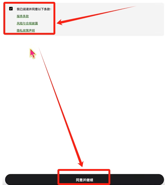 勾选一下服务条款,点击【同意并继续】。如果你刚刚这一步没有操作好,可以返回关闭APP重新开始,千万不能把居住地址选错了。