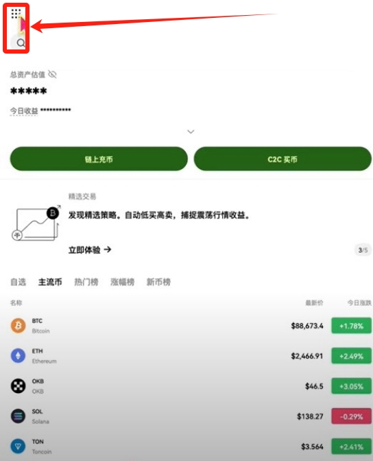 注册完之后怎么样去看自己的手续费标准,首先我们在欧易App收到点击左上角的9个小点。