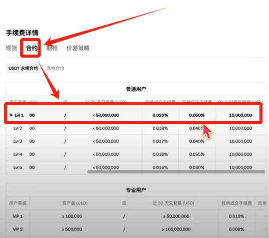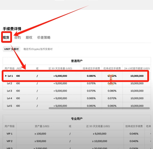 我们往下找,接下来它会给你一个特别复杂的一个表,我们只看两部分。一个是现货手续费,一个是合约手续费。而我们看的时候只看最低等级的现货里边,最低等级的现货手续费是挂单8/10000,吃单是1/1000。