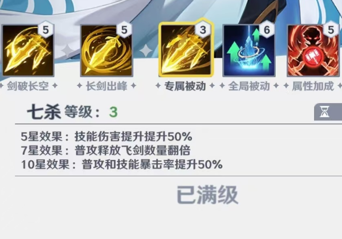 被动技能七杀,在尘心这个角色升到五星的时候,伤害可以提升50%。该技能的具体效果为释放普攻的时候,飞剑的数量可以翻倍,这不仅意味着输出的效果可以翻倍,并且暴击的概率也会翻倍哦。当达到10星的时候,这个效果会更加强大,并且几乎每个技能都是可以出暴击的。另一个被动技能叫做剑道无双,在战斗时将会削弱敌人的防御力,并且当推图的时候,尘心的存在能够使所有角色的伤害提升18%。