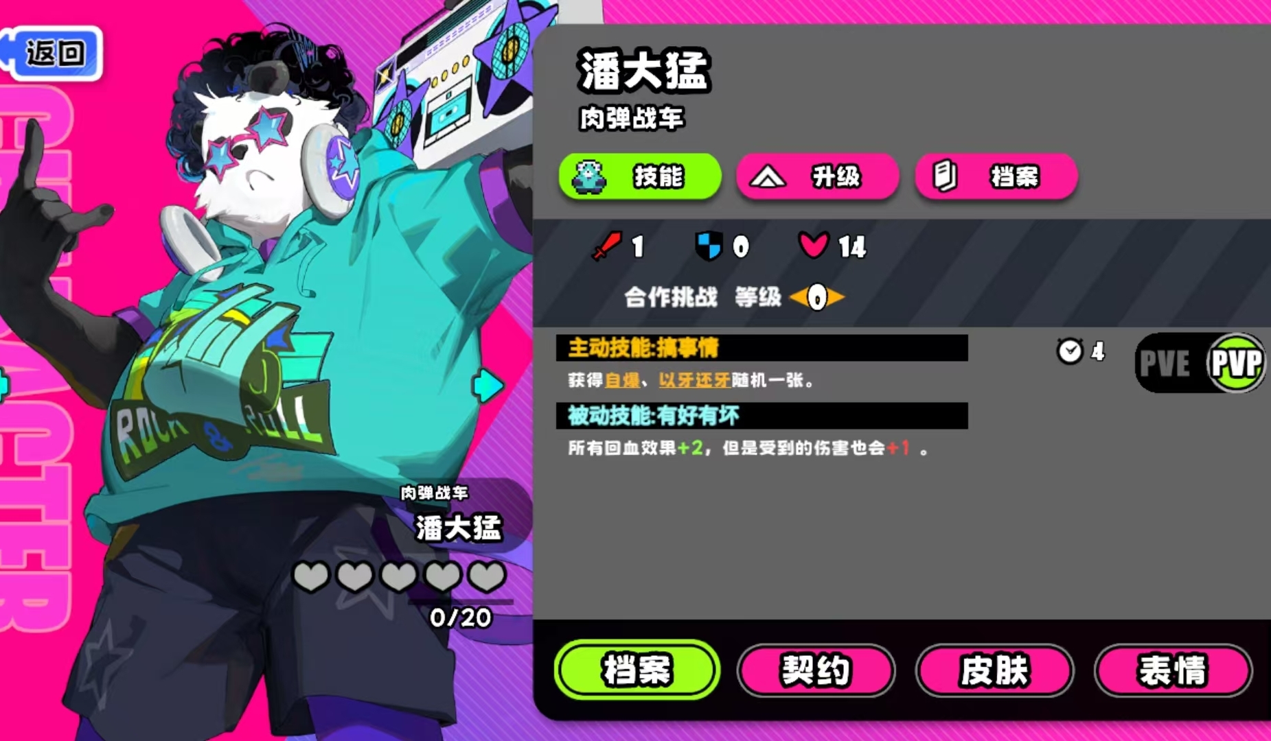 潘大猛能通过使用主动技来立刻获得手牌,但不同模式下该主动技可让潘大猛获得的手牌类型也很不一样,其中合作模式能拿到巧克力蛋糕、汉堡等能为之恢复的手牌,且他的被动也会被更改为食用这两种手牌后,能以自身所在位置为基点,为其它角色恢复2点生命,只要使用了对应的手牌就能立刻触发,不限次数。但在标准模式里,能拿到的手牌就变成自爆和以牙还牙,前者使用时除了会扣自己血外,还能让效果范围内的敌人被强制扣5点血量,后者则可帮潘大猛反弹他人对自己发动的效果手牌。