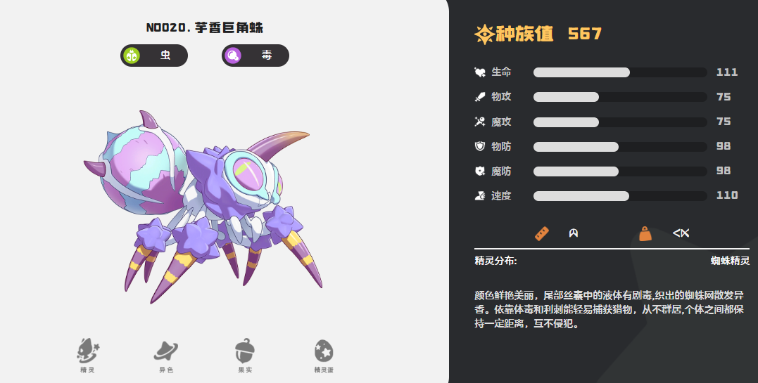 芋香巨角蛛负责毒素体系构建:当敌方使用低能耗技能时,将使其陷入中毒状态。技能搭配以毒攻毒为核心,可在敌方中毒期间持续提升自身攻击力;毒液渗透用于叠加中毒层数并附加魔法伤害;防御技能维持生存下限;扬沙则提供额外物理打击手段,整体输出维度丰富。