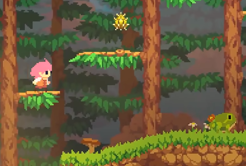 后续区域首个宝箱位于低矮通道内,需蹲伏滑行方可取得。拾取后向上移动,在岔路口将同时遭遇史莱姆与青蛙。推荐优先处理史莱姆,再集中应对跳跃频率更高的青蛙。继续攀爬时需留意树枝承重机制——每根枝干仅支持单次站立,踩踏后即断裂,务必规划好落点顺序。