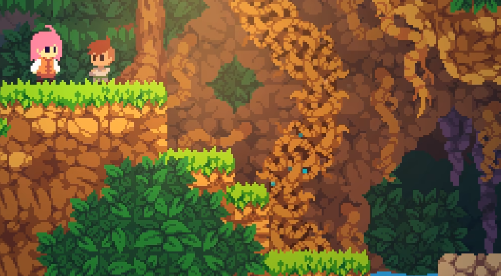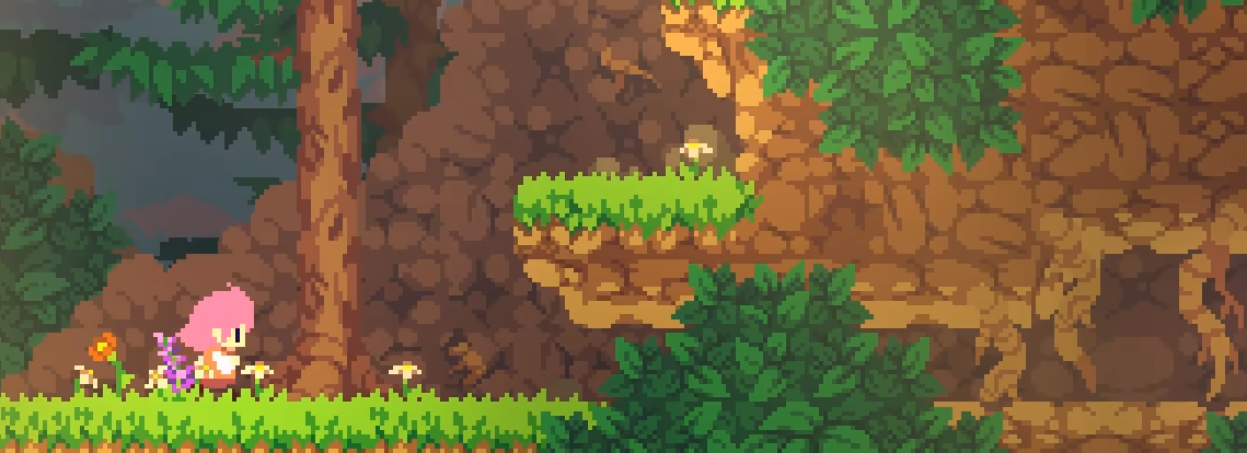 该区域将解锁冲刺与冲刺跳跃功能。附近另有一只青蛙,可利用上方尖刺果坠落轨迹将其砸伤,实现高效控场。清理后下行,迎战三只史莱姆,须全部消灭方可通行。抵达山洞入口时,可见一只高防御虫型敌人,当前角色无法破防,应直接从其头顶跳跃通过。洞口旁可拾取心跳香草。