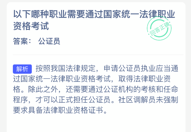以下哪种职业需要通过国家统一法律职业资格考试?【蚂蚁新村每日一题】2025年12月30日题目已发布!坚持答题,积累木兰币,即可加速小镇建设。答对本题,立即可享“产速+3/时”的加速奖励!今天正确答案是【公证员】。按照我国法律规定,申请公证员执业应当通过国家统一法律职业资格考试,取得法律职业资格。