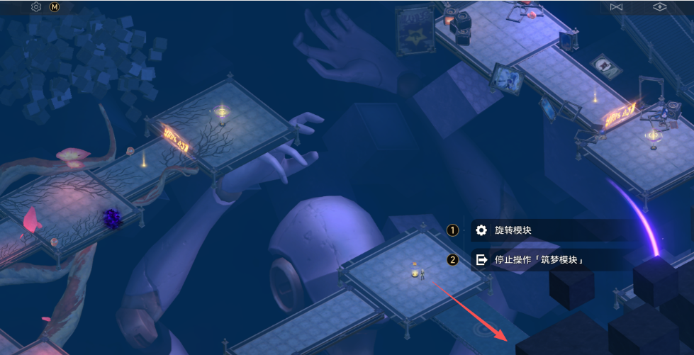 直走右转找到「筑梦模块」,操作「筑梦模块」旋转模块连通主线任务没走的那条路(忘记了可以都走一遍)
