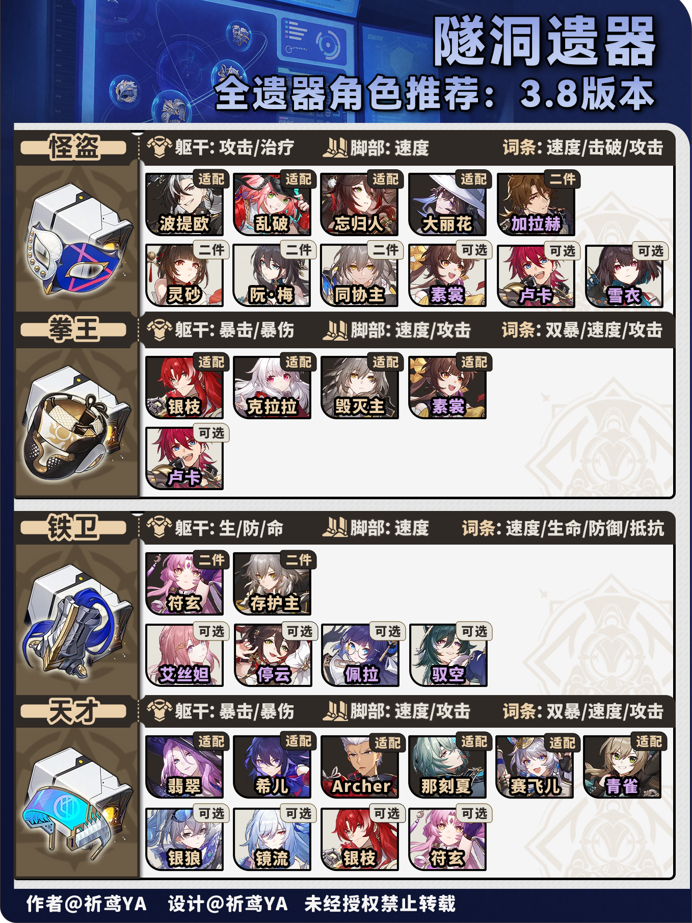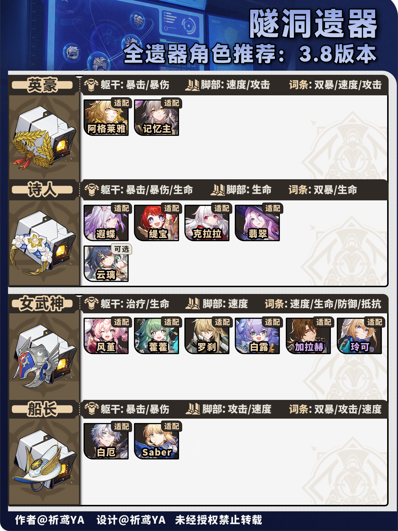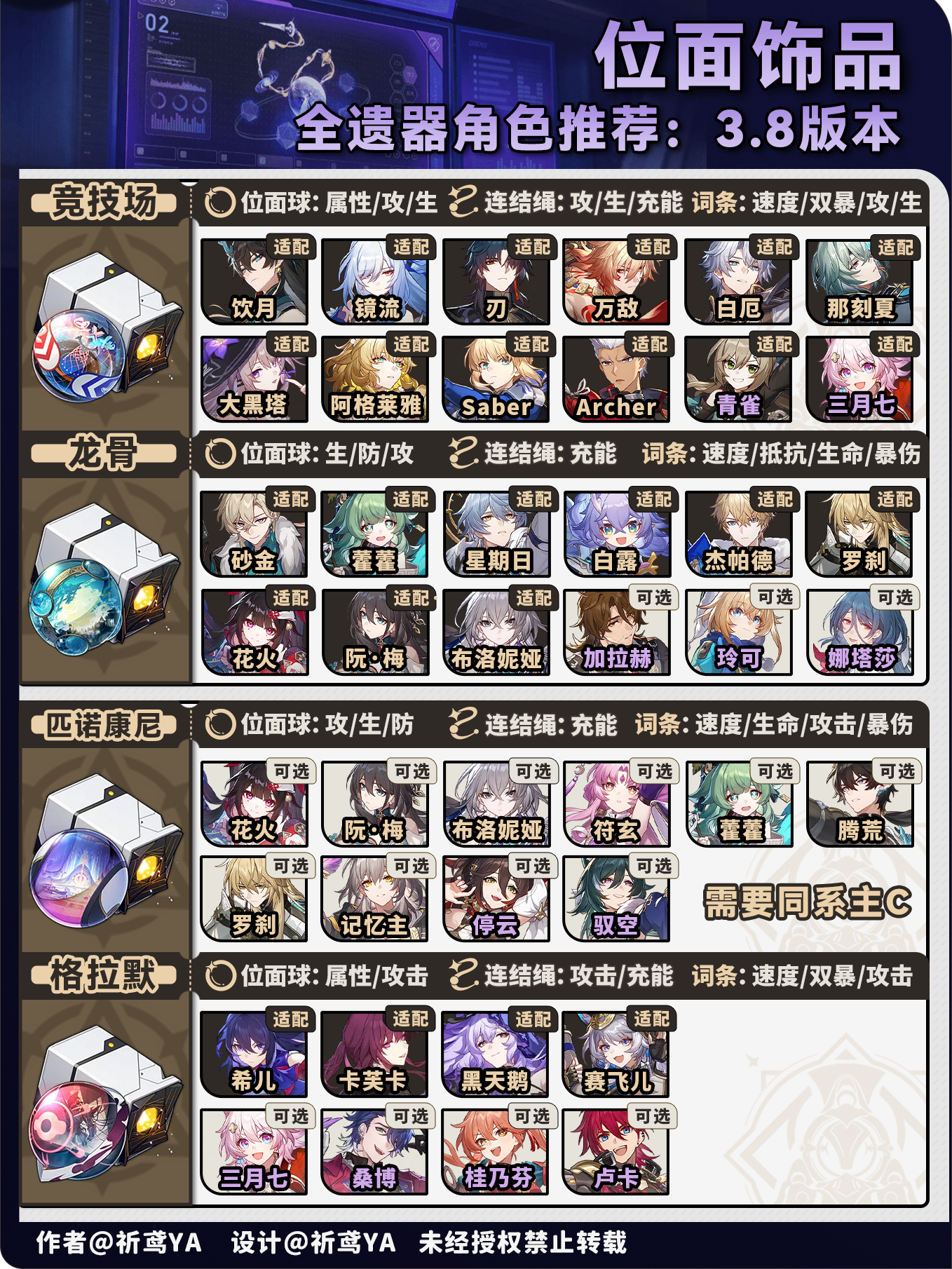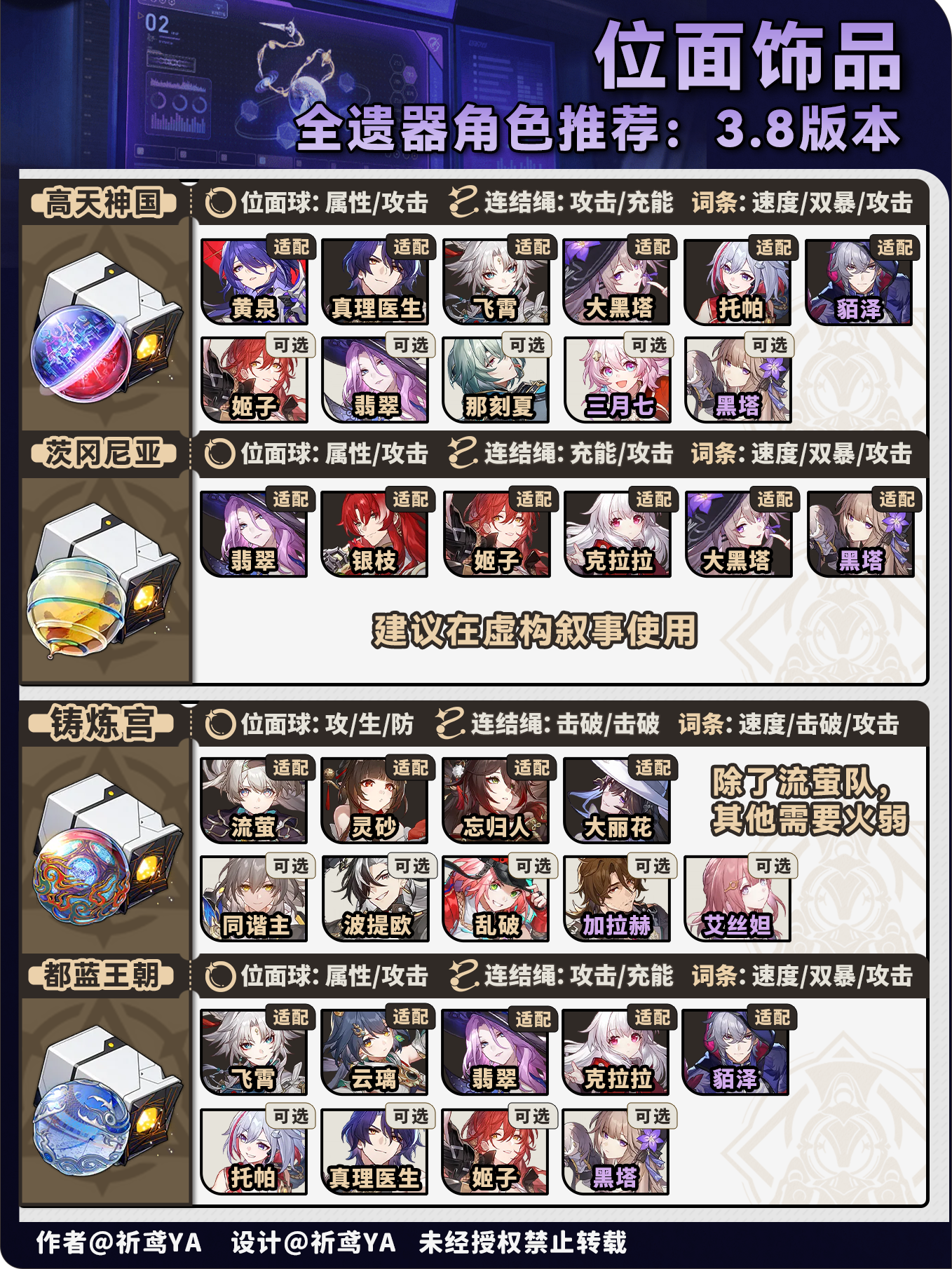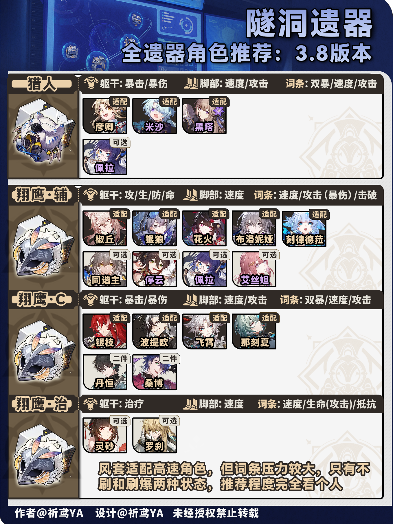 (1)对推荐程度简单分级,主要看适配程度,以及角色适配遗器的种类多少