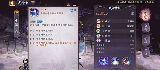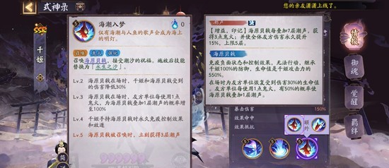 当海原贝戟在场上时,千姬和海原贝戟或者伤害减免,友方单位每使用1点鬼火,可以给海原贝戟增加1层潮声(每叠7层潮声就可以回3点火,并使全体友方伤害永久提升。)