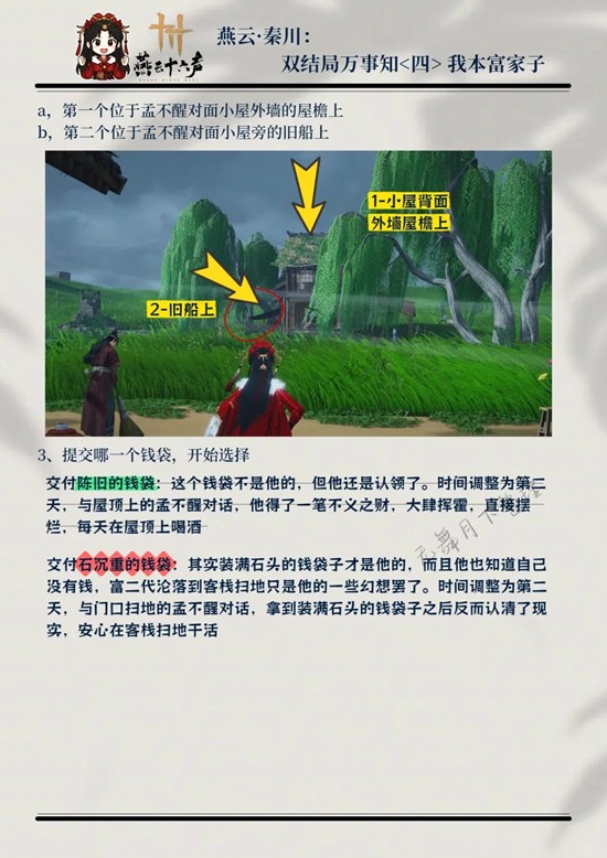 2、提交哪一个钱袋,开始选择交付陈旧的钱袋:这个钱袋不是他的,但他还是认领了。时间调整为第三天,与屋顶上的孟不醒对话,他得了一笔不义之财,大肆挥霍,直接摆烂,每天在屋顶上喝酒