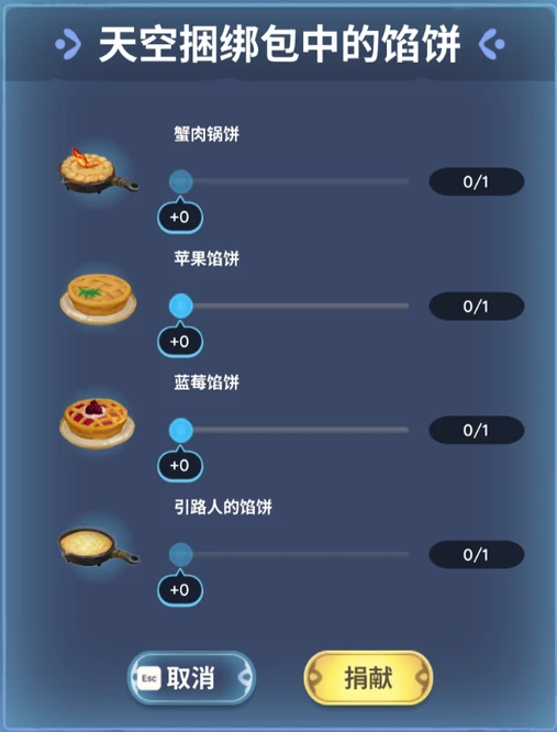 蟹肉锅饼、苹果馅饼、蓝莓馅饼、引路人的馅饼