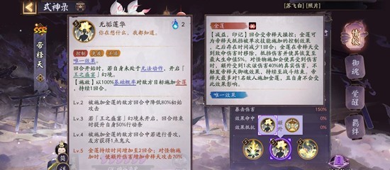 三技能:攻击敌方全体,造成伤害,可以使自己和生命最低的友方回血。如果金莲消失了,解除自身所有控制状态。免消耗释放一次三技能,不触发敌方御魂和被动。
