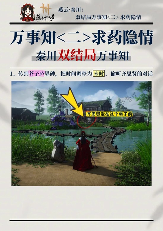 燕云十六声游戏中会有多种不同的玩法风格,如剑术、武技、甚至是太极等,可以混合搭配剑法、近身战等来战斗。游戏中有万事知的探索玩法,那么秦川双结局万事知此亲非亲和求药隐情应该怎么做呢?为你准备了一份攻略,一起来看看吧~