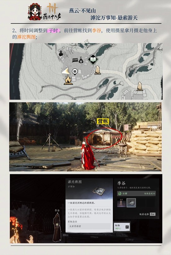 2、将时间调整到子时,前往营帐找到李谷,使用摄星拿月摄走他身上的滹沱舆图;