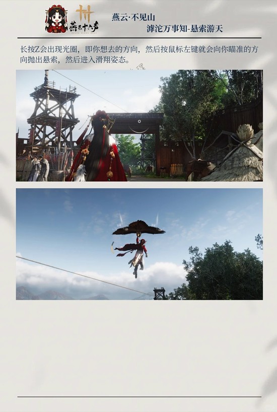 长按Z会出现光圈,即你想去的方向,然后按鼠标左键就会向你瞄准的方向抛出悬索,然后进入滑翔姿态。