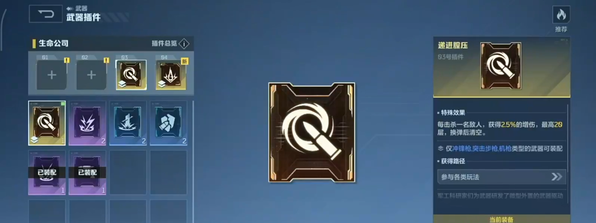 枪械系统以宝箱抽取为主要获取方式,高品质武器掉落率随活动周期动态调整。真正影响实战表现的是插件装配系统:每把武器配备4个专属插槽(1号位仅限1号插件),插件按颜色区分效能层级——蓝色、紫色插件通用性强,适配全部武器;金色及以上插件则绑定特定武器类型,虽兼容范围受限,但提供更高幅度的属性加成与专属特效,是中后期战力突破的核心支点。