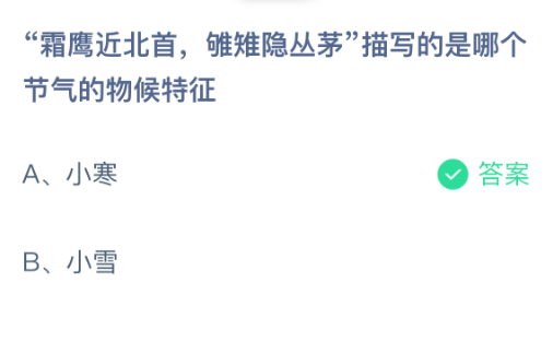 以上就是霜鹰近北首,雊雉隐丛茅描写的是哪个节气的物候特征,支付宝蚂蚁庄园2026年1月5日答案最新,更多精彩内容,请点击关注0405手游网更新!