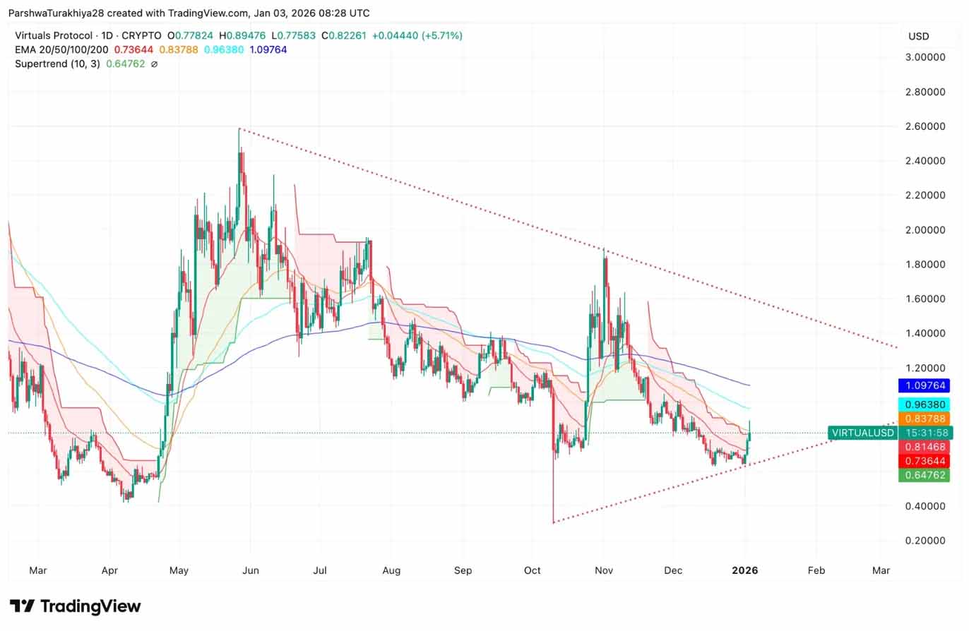 当前价格在0.64-0.89美元区间震荡,低于0.73美元至1.09美元所有关键EMA均线。多头需突破0.90-0.96美元阻力带才能测试1.10美元关口,而0.64美元超级趋势线构成重要支撑。跌破该支撑可能下探0.50-0.55美元区间。