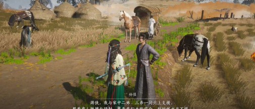 先来到地图上这个位置,和这里的杨壮对话,任务跟前面一样也是教他射箭,杨强、杨媛、杨壮三人曾以打劫为生,自边关战事吃紧,他们决定一同北上,约好练成骑射之术后,一起驰援前线。他们是彼此最亲近的人,却也在暗自互相较劲,谁都不肯落后于另外两人。