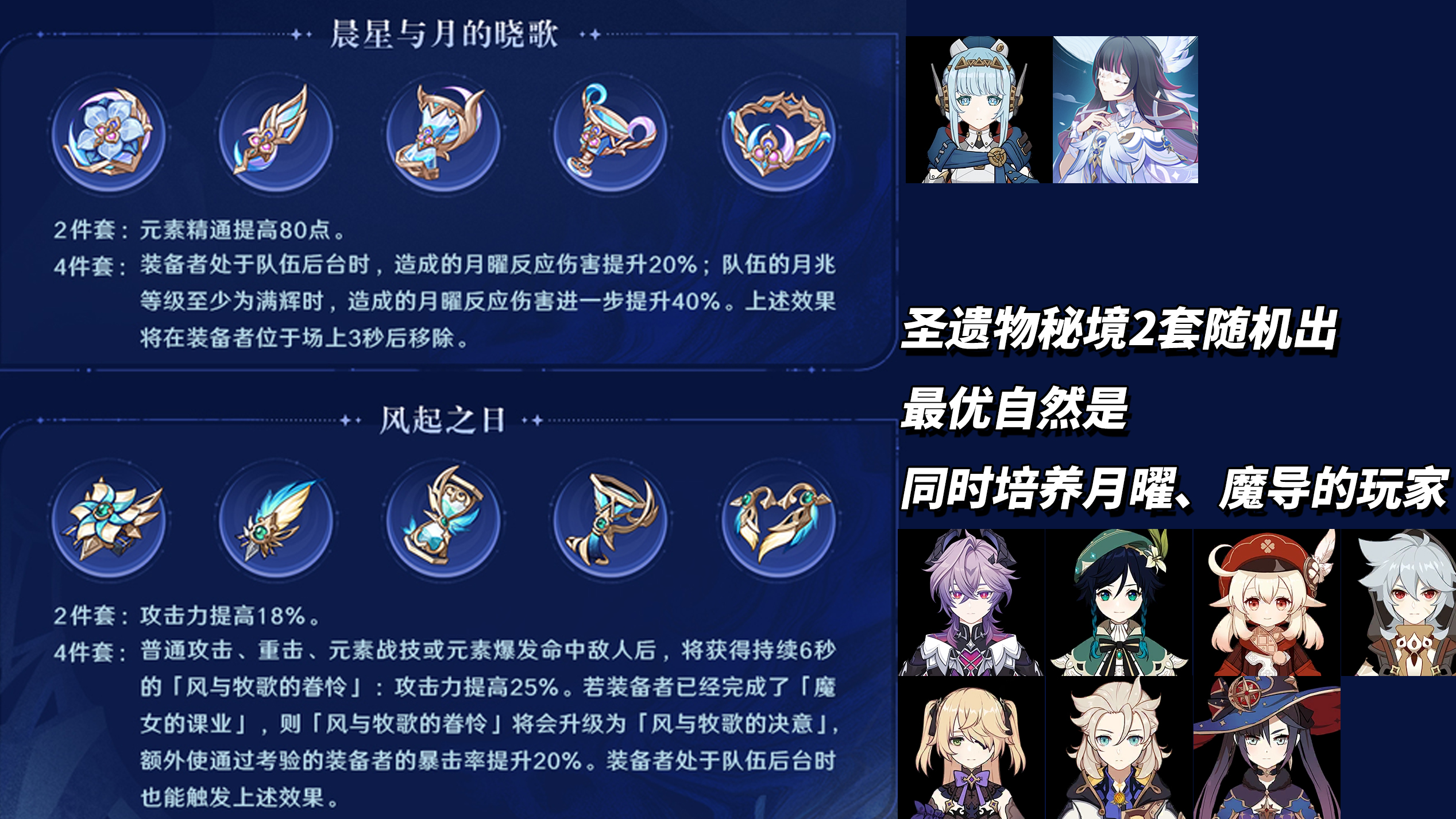 由于圣遗物秘境是2套随机出,最优自然是同时玩月曜与魔导体系的玩家。目前这2套数值都不错,准备后续挪德卡莱新角色继续投入,可提前准备一下。反之,当前无且未来也不准备抽月曜/魔导角色,新秘境对你来说价值为0。