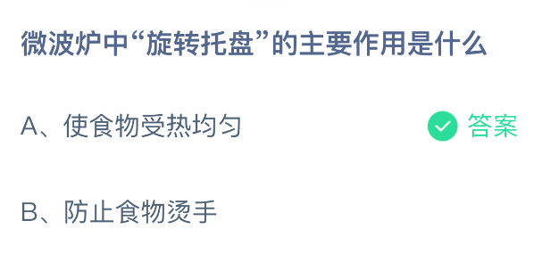 微波炉中“旋转托盘”的主要作用是什么?支付宝小鸡课堂开课啦!每天花一分钟答题赚饲料,喂喂小鸡就能贡献爱心啦!轻松又意义十足!2026年1月6日蚂蚁庄园的小鸡课堂题目正确答案是【使食物受热均匀】,微波炉中“旋转托盘”的主要作用是使食物受热均匀。